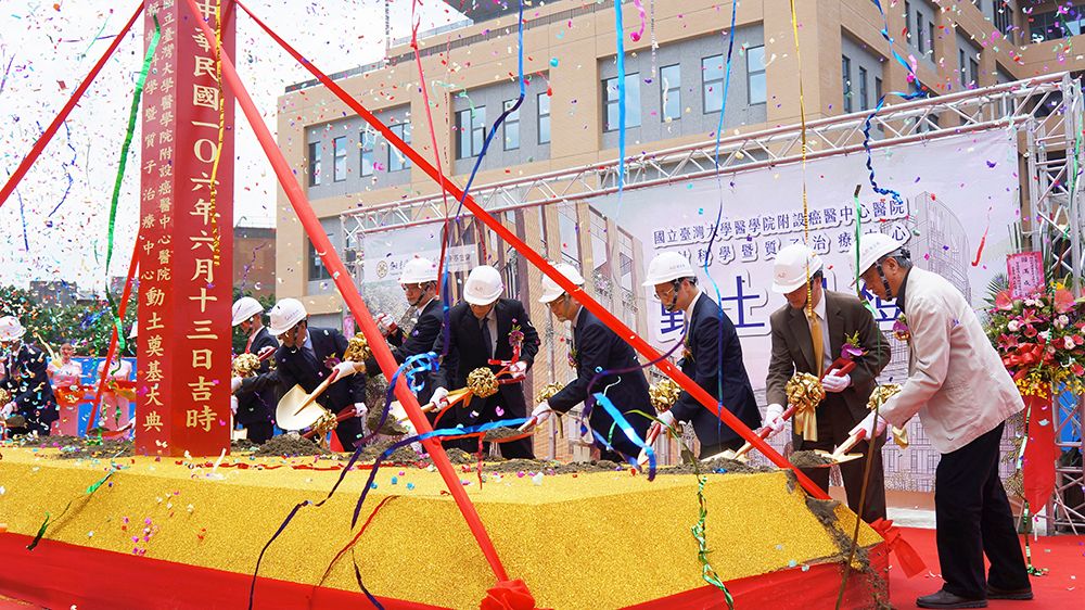 The groundbreaking ceremony for the Radiation Science and Proton Therapy (RSPT) Center of National Taiwan University (NTU) Cancer Center was held on June 13, 2017. NTU President Pan-Chyr Yang (楊泮池) and YongLin Health Foundation Founder Terry Guo (郭台銘), who is also the chairperson of Foxconn, looked forward to integrating collaborations related to radiation science and medicine to help treat and prevent various types of cancer.