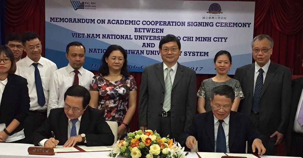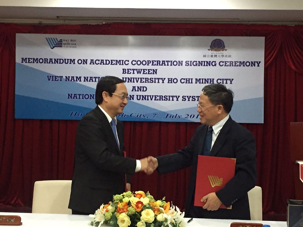 To facilitate academic collaboration and exchange with Vietnam, President Ching-Ray Chang (張慶瑞) of National Taiwan University System (NTUS) and representatives of NTUS members visited the headquarters of Viet Nam National University Ho Chi Minh City (VNUHCM) on July 7, 2017. During the visit, President Chang discussed future collaboration and signed a memorandum on academic cooperation with VNUHCM President Huynh Thanh Dat. Director General Liang Kuang-Chung (梁光中) of Taipei Economic and Cultural Office in Ho Chi Minh City attended the signing ceremony as well.