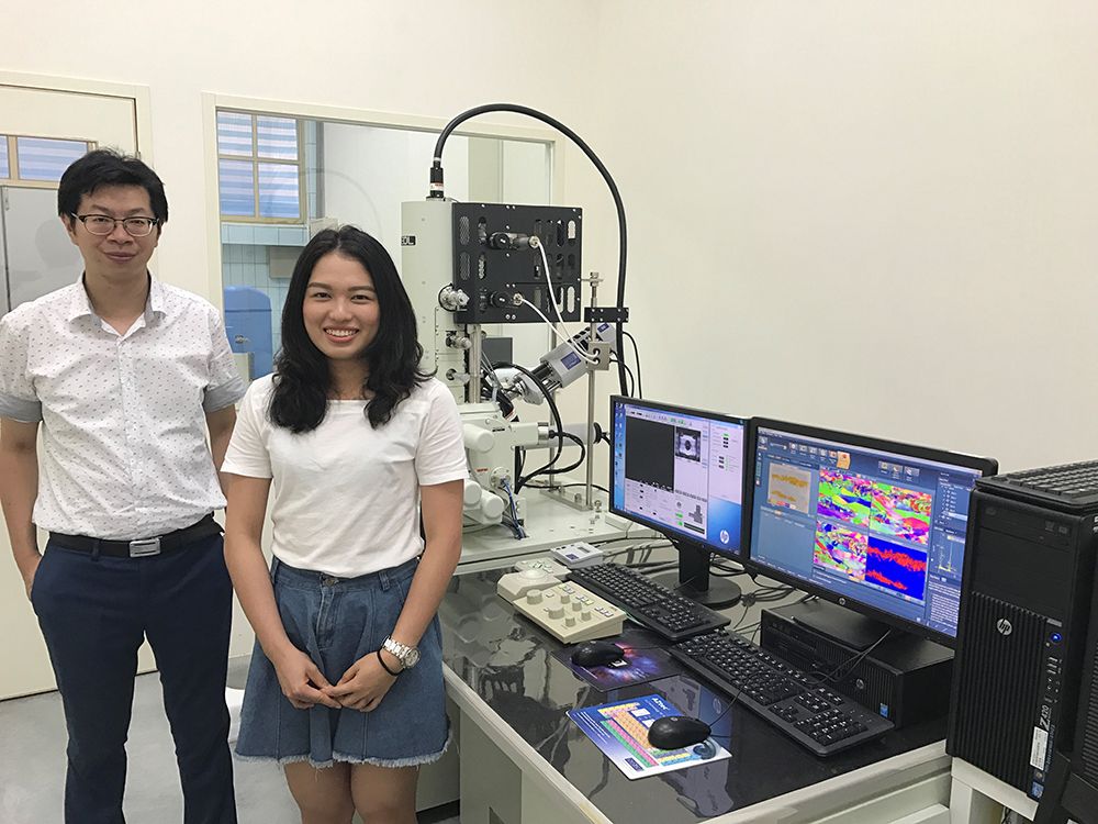 NTU team members, Guan-Ju Cheng and Prof. Hung-Wei Yen, at the Scanning Electron Microscope Lab