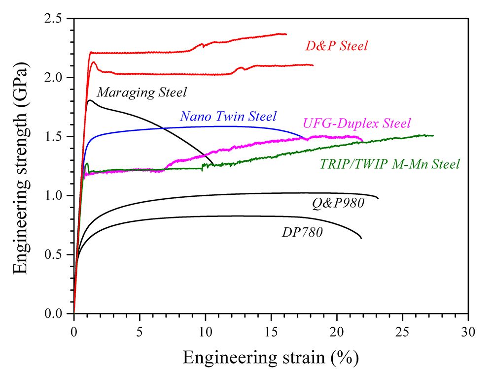 Figure 1. Tensile properties of D&P steel compared with other high strength steels, including maraging steel, nanotwinned (NT) steel, UFG-Duplex steel, TRIP/TWIP M-Mn steel, quenching and partitioning (Q&P980) steel, and dual-phase (DP780) steel.