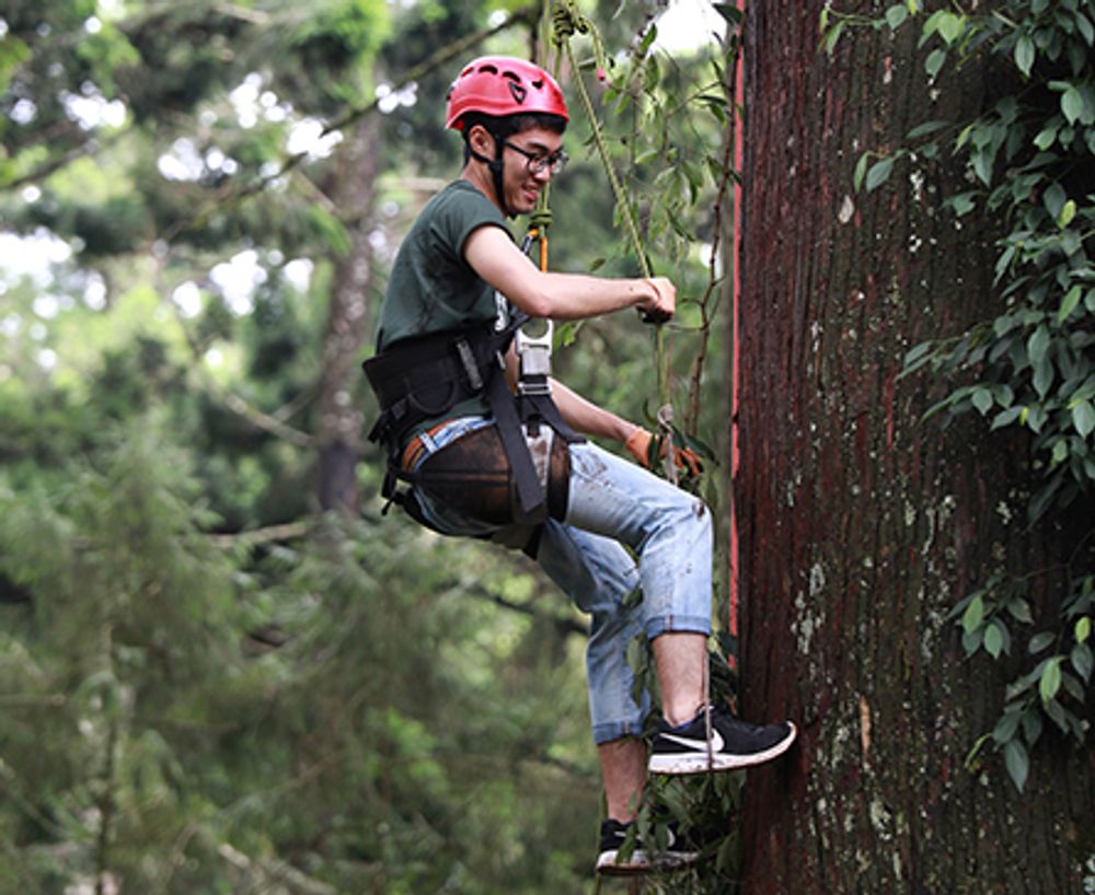 A BXAI student climbs a tree in Xitou Nature Education Area.