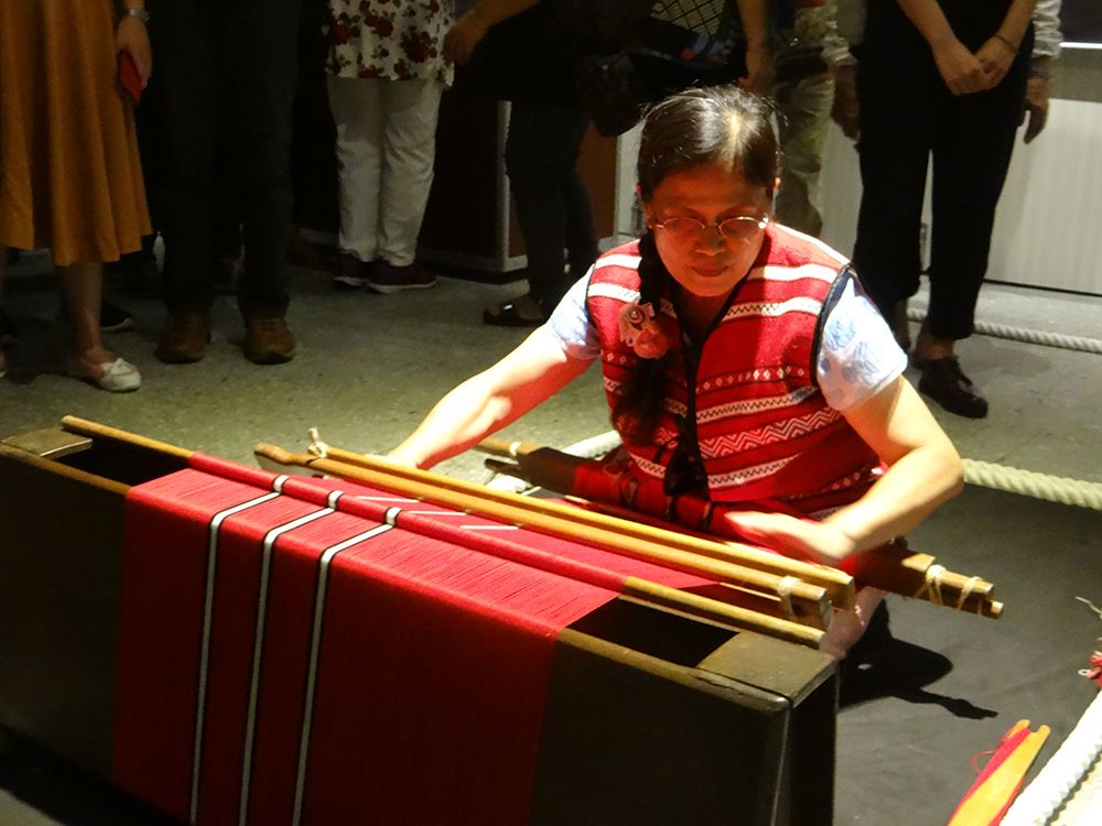 After the ceremony, Prof. Hu led the attendees, who had been standing under the sun for a while, into the air-conditioned special exhibition room of the museum. Li-Mei Pan (潘麗鎂), a Saisiyat woman weaver, demonstrated how to use a loom while Lalu (菈露) explained its mechanism to the attendees. Next, Prof. Hu briefly introduced the exhibition and invited President Feng and Ms. Shu-Li Lin (林淑莉), who was the mentor of the weavers in the project, to explain the reproduced works and the reproduction process. Finally, Ms. Zhao shared with the attendees the story of her heirloom—the long upper garment.