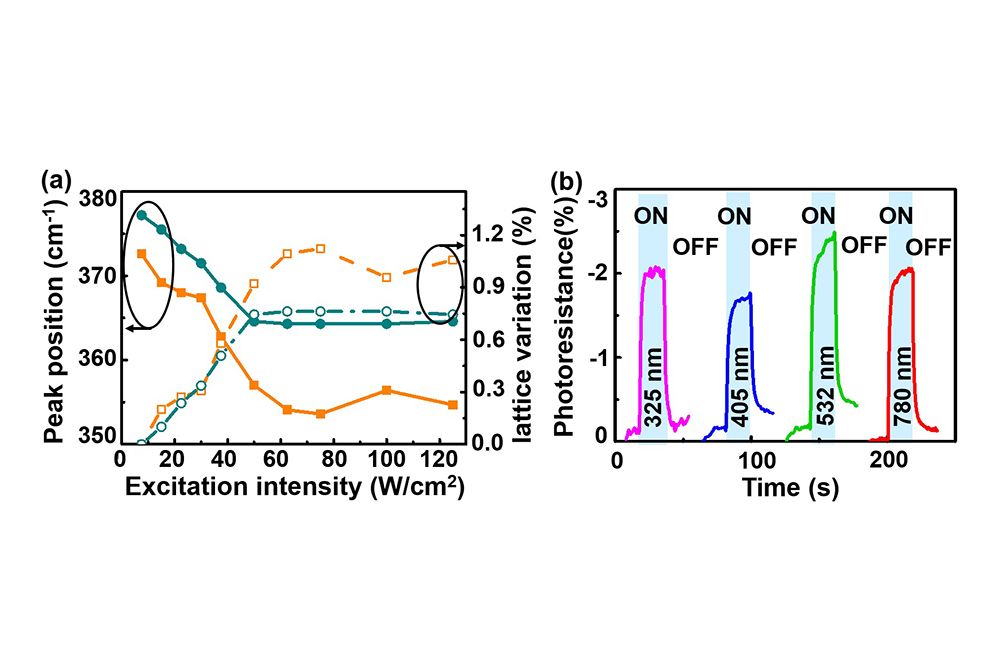 Figure (a) shows the light-induced photostriction of SRO and how the crystalline lattice changes with excitation intensity. Figure (b) indicates that photoresistance varies when SRO is induced by light with different wavelengths.
