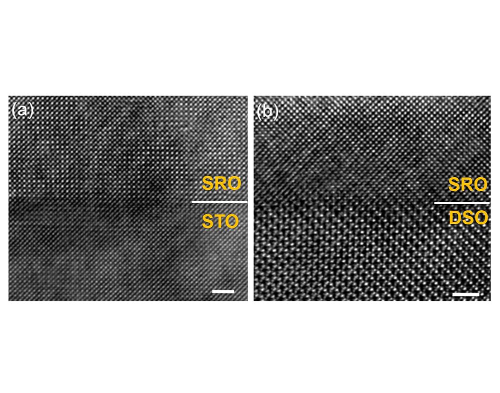 SRO is deposited using PLD on strontium titanate (Figure a) and dysprosium scandium (Figure b) substrates.