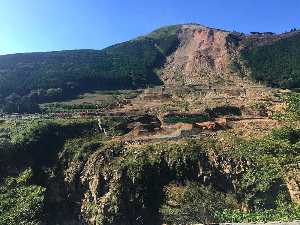 The island of Kyushu, Japan, is located at the eastern end of the Okinawa Trough, close to the convergent zone between the Eurasian and Philippine Sea plates. As Kyushu and the island of Taiwan have similar tectonic settings, it is intriguing to compare their geomorphic and geologic features, which helps us better understand the tectonics of Taiwan. Thanks to the support from the NTU College of Science, Assistant Prof. Ray Y. Chuang (莊昀睿) led 10 undergraduate and graduate students of the Department of Geography to join a collaborative field course, “Special Topics and Research in Physical Geography,” with the Department of Earth and Planetary Sciences at Kyushu University in Kyushu, Japan in late October, 2017. In Japan, the field class was led by Prof. Kaoru Kashima (鹿島 薫) together with other Japanese professors and researchers. The course focused on the 2016 Kumamoto earthquakes (熊本地震) and the volcanic activities at Unzen (雲仙), Aso (阿蘇), Kuju (九重), Beppu (別府), Kirishima (霧島), and Sakurajima (桜島).