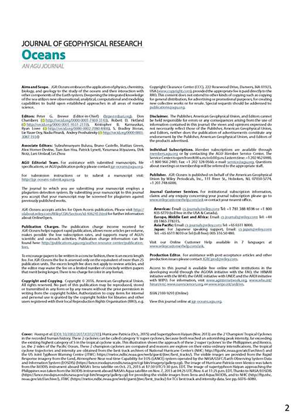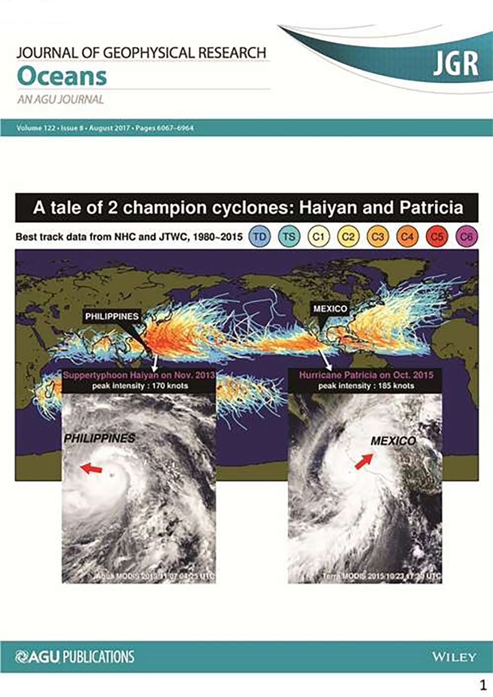 The research findings by NTU PhD student of atmospheric sciences Hsiao-Ching Huang (黃筱晴) and a number of collaborators in an international team were published in volume 122, issue 8 (August, 2017) of American Geophysical Union’s Journal of Geophysical Research: Oceans, and selected as the issue’s cover image with the title of “A Tale of 2 Champion Cyclones: Haiyan and Patricia.” The other collaborators include Dr. Julien Boucharel and Prof. Fei-Fei Jin (金飛飛) from the University of Hawai’i, and Prof. I-I Lin (林依依) from the NTU Department of Atmospheric Sciences.