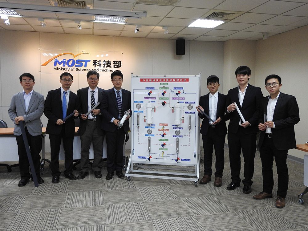 An NTU chemical engineering team pioneers a technology for carbon adsorption and conversion. From left are Deputy Director General Yu-Ting Lai (賴宇亭) of the MOST Department of Engineering and Technology, NTU Prof. of Chemical Engineering Cheng-Liang Chen (陳誠亮), NTU Prof. of Chemical Engineering Kuo-Lun Tung, MOST Deputy Minister Yu-Chin Hsu (許有進), and NTU Prof. of Chemical Engineering Chia-Wen Wu (吳嘉文).
