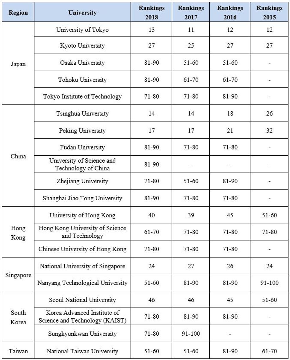 Asian universities ranked in the World Reputation Rankings 2015-2018: