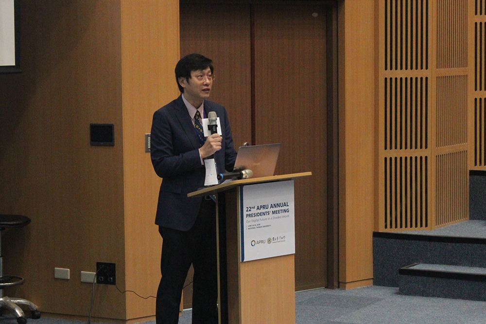 NTU Interim President Tei-Wei Kuo gives opening remarks at the 22nd APRU APM.