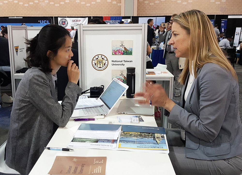 NTU Manager for Global Engagement Guan-Yu Chen (陳冠瑜; left) in a conversation with a UC Berkeley representative.