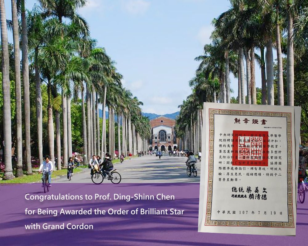 NTU Prof. and Academician Ding-Shinn Chen (陳定信) was awarded the Order of Brilliant Star with Grand Cordon by R.O.C. President Ing-Wen Tsai (蔡英文) on July 19 for his seminal contribution to hepatitis R&D and prevention in Taiwan and across the world.