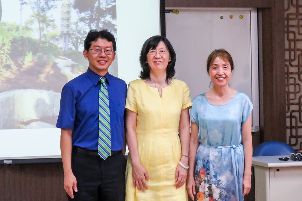 Dean of Liberal Arts Huang (middle), former Director Chiu (right), and new Director Kao (left) pose for a group photo.