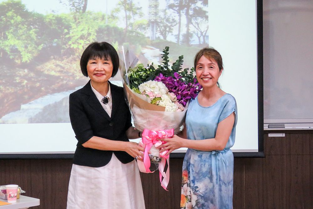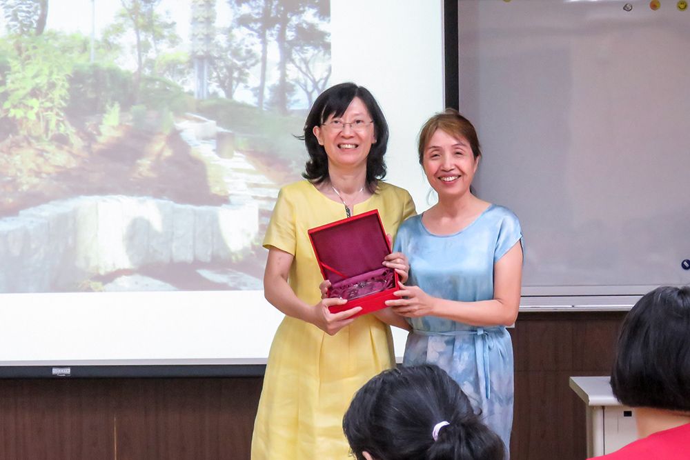 After this brief exchange, the representatives enjoyed a slideshow of ICLP and reflected on the various contributions of Director Chiu over the last three years in a warm and genial atmosphere. Afterwards, the ceremony began with an address by Dean Huang, followed by remarks from the outgoing and incoming ICLP Directors, with words of farewell and encouragement to teachers and administrative staff. Dean Huang presented flowers and a commemorative plaque during the ceremony to Director Chiu for her contributions to ICLP during her term of office.