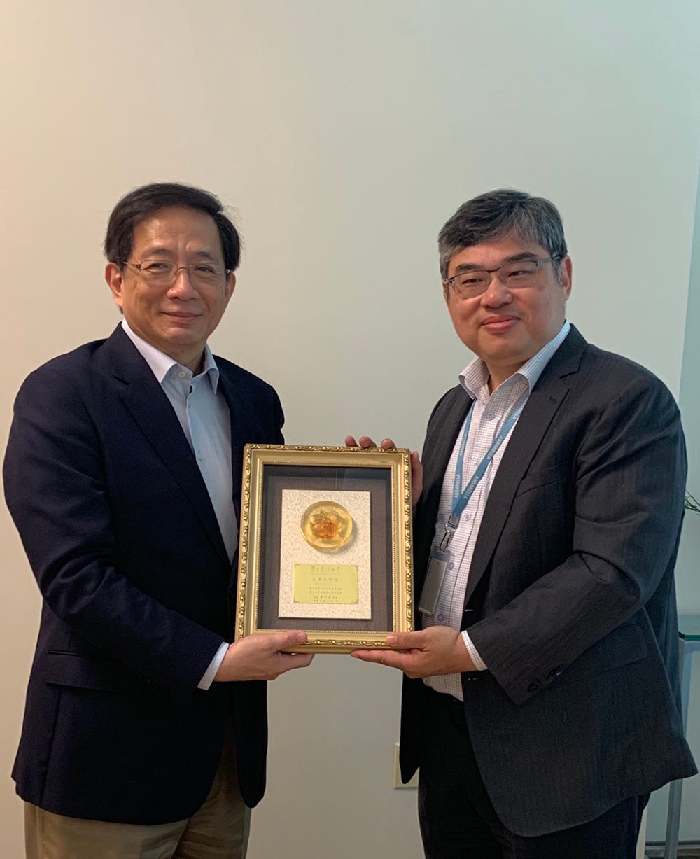 President Kuan (left) presents an appreciation plaque to alumnus Fermi Wang (right).