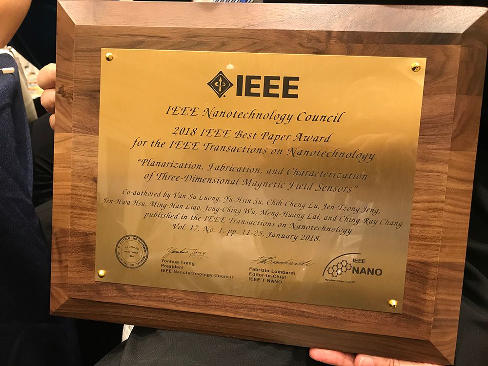 The cross-campus and interdisciplinary research team led by NTU Prof. Ching-Ray Chang (張慶瑞) received T-NANO Best Paper of the Year 2018 Award for their paper titled, “Planarization, Fabrication, and Characterization of Three-Dimensional Magnetic Field Sensors,” published in the IEEE Transactions on Nanotechnology (TNANO), Vol. 17, No. 1, pp. 11-25, January 2018. This result was finalized on July 26, 2019, and the award was presented to the team at the 19th IEEE International Conference on Nanotechnology (IEEE NANO 2019) in Macau, China, on the same day.