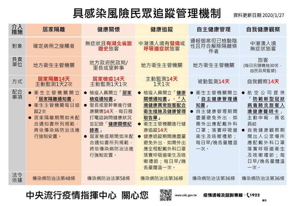 - If you have visited China Mainland Hubei Province, please conduct self-quarantine for 14 days and be sure no physical contact with other people within this time frame. Once there is coughing or fever, please call 1922 government infection control hotline or NTU Health Center: 3366-2156 (office hours 8 AM to 5 PM) or Campus Safety Center 3366-9119 (24 hrs.). During this quarantine period, you are not permitted to go outside for any reason including the class.