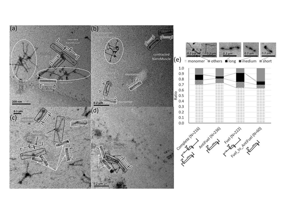 Assembled DNA origami NanoMuscle at each stage. (a) Complete NanoMuscle (b) AntiFuel NanoMuscle: After AntiFuel staples are added, NanoMuscle contracted. (c) Fuel NanoMuscle: After Fuel staples are added, NanoMuscle extended. (d) Fuel-to-AntiFuel NanoMuscle: After AntiFuel staples are added to extended (Fuel) NanoMuscle, NanoMuscle contracted again. (e) The ratio of each length of NanoMuscle in the four states mentioned in (a) to (d).