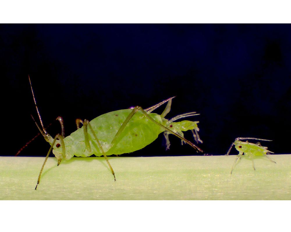 Asexual viviparous reproduction of the pea aphid Acyrthosiphon pisum. A female aphid mother is giving birth a baby aphid parthenogenetically and viviparously. The first-instar aphid on the far right has been completely separated from her mother.