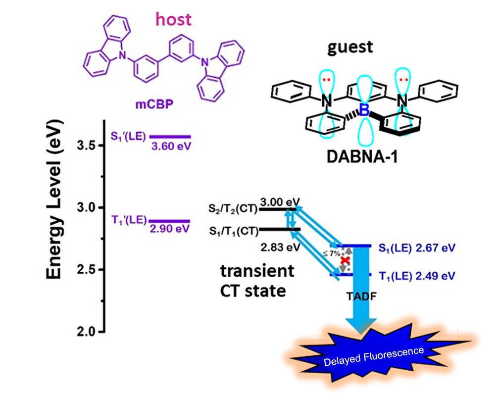 Due to their near-100% light emission efficiency and high color purity, multiple resonance-induced thermally activated delayed fluorescence (MR-TADF) materials have in recent years received a deal of attention compared with conventional TADF and other metal complex phosphorescence materials. However, one phenomenon has always puzzled researchers: for some MR-TADF materials, their molecules exhibit very strong fluorescence when photoexcited, yet there is no sign of delayed fluorescence. On the other hand, doping these types of luminescent materials in a suitable host material will produce a significant delayed fluorescence. Delayed fluorescence is an important mechanism in organic electroluminescent diode (OLED); it can be obtained by capturing the triplet state upon thermal activation, thereby achieving 100% light emission quantum efficiency. MR-TAD isolates molecules and produces completely different photophysical phenomena through host-guest mixtures, which has for many years perplexed researchers across the world and hampered progress in OLED-related research.