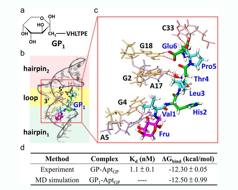 Diabetes mellitus is a common metabolic disorder that has a major impact on the quality of life for patients. Early detection and effective therapy are critical in treating diabetes. Professor Yit-Tsong Chen from the Department of Chemistry of the National Taiwan University, together with two physicians from the Mackay Memorial Hospital, Dr. Chih-Yang Chen and Dr. Tse-Hao Chen, in collaboration with the theoretical calculation team led by Professor Sheh-Yi Sheu from the National Yang Ming Chiao Tung University, used the SELEX (systematic evolution of ligands by exponential enrichment) method (Figure 1) to screen and identify a novel 40-base, single-stranded DNA aptamer (AptGP, Figure 2), with high binding affinity to glycated hemoglobin A1c (HbA1c) in human blood. AptGP bound to the glycated N-terminus of the hemoglobin β-chain (i.e. Fru-Val-His-Leu-Thr-Pro-Glu-COOH, denoted by GP) to form the GP-AptGP complex. The dissociation constant in phosphate buffered saline (PBS) was Kd = 1.1 ± 0.1 nM. The team led by Professor Sheh-Yi Sheu used molecular dynamics simulation in calculations to further construct the three-dimensional structure of the GP-AptGP complex (Figure 3).