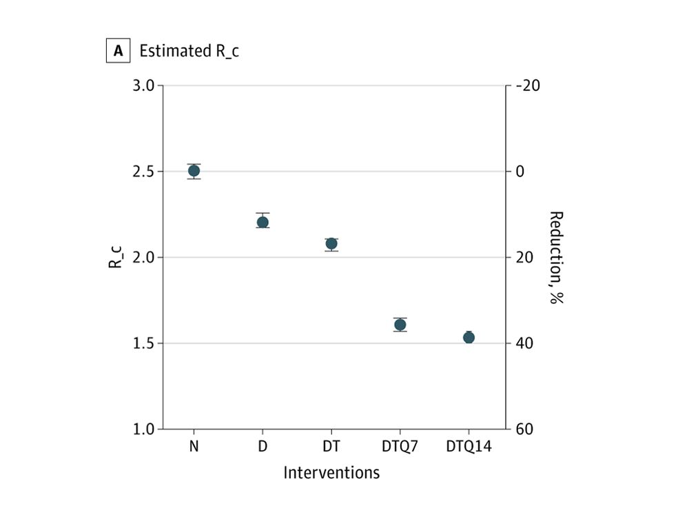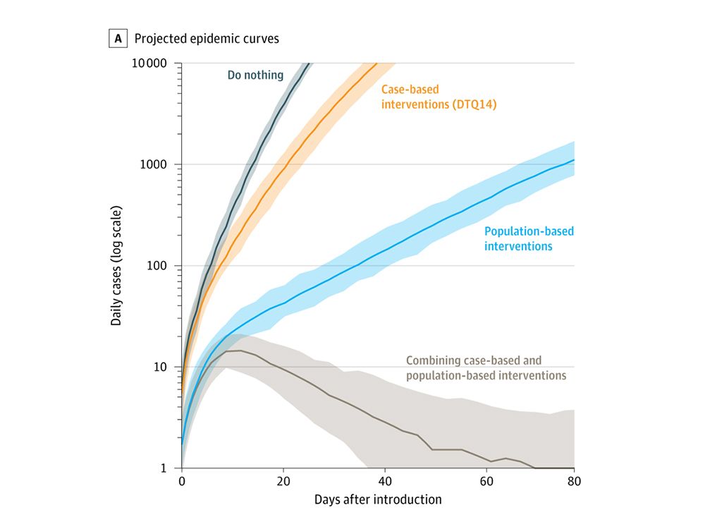 The study found that the independent use of case-based or population-based COVID-19 interventions could only reduce the reproduction number to 1.53 and 1.30 respectively, which would be insufficient for epidemic control (requiring a reproduction number of less than 1). As a result, Taiwan would likely still see at least 30,000 or 400 new cases on the 60th day of a potential outbreak. However, when combined case-based and population-based interventions, the reproduction number was estimated to fall to 0.85, where there would only be 1.7 new cases on the 60th day and zero case on the 84th day of a potential outbreak.