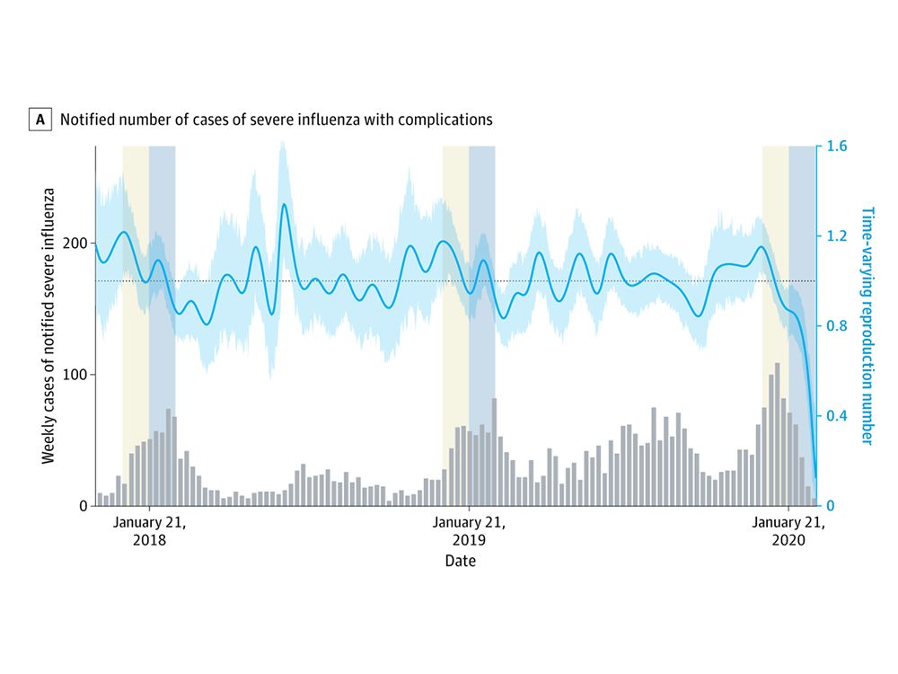 According to the analysis, the reproduction number of COVID-19 cases (the number of secondary cases generated by one primary case) without any intervening measures was estimated to be 2.50. When only case-based interventions (case detection, contact tracing, and 14-day quarantine of close contacts) were implemented, the reproduction number was estimated to decrease by 39% from 2.50 to 1.53. Meanwhile, voluntary population-based interventions (social distancing and facial masking), if used alone, were estimated to have reduced the reproduction number by 48% to 1.30. A parallel trend of reduction in Taiwan’s severe influenza cases was also observed under the population-based COVID-19 interventions: the reproduction number of severe influenza cases plummeted to a new low in one month after the first COVID-19 case was confirmed on January 21, 2021 in Taiwan. It was inferred that the outbreak of COVID-19 and its corresponding measures, including the public’s voluntary facial masking, had contributed to the reduction in severe influenza cases.