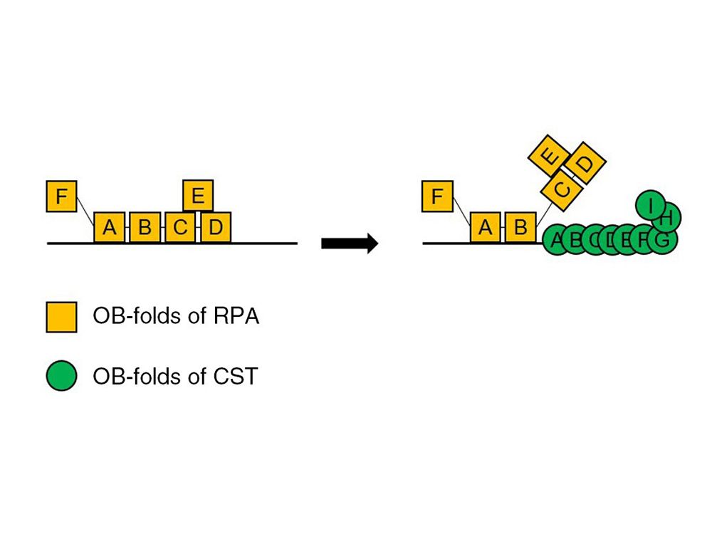 Figure 1. CST and RPA co-occupy the same single-stranded DNA, through OB-fold domains with different DNA binding affinities.