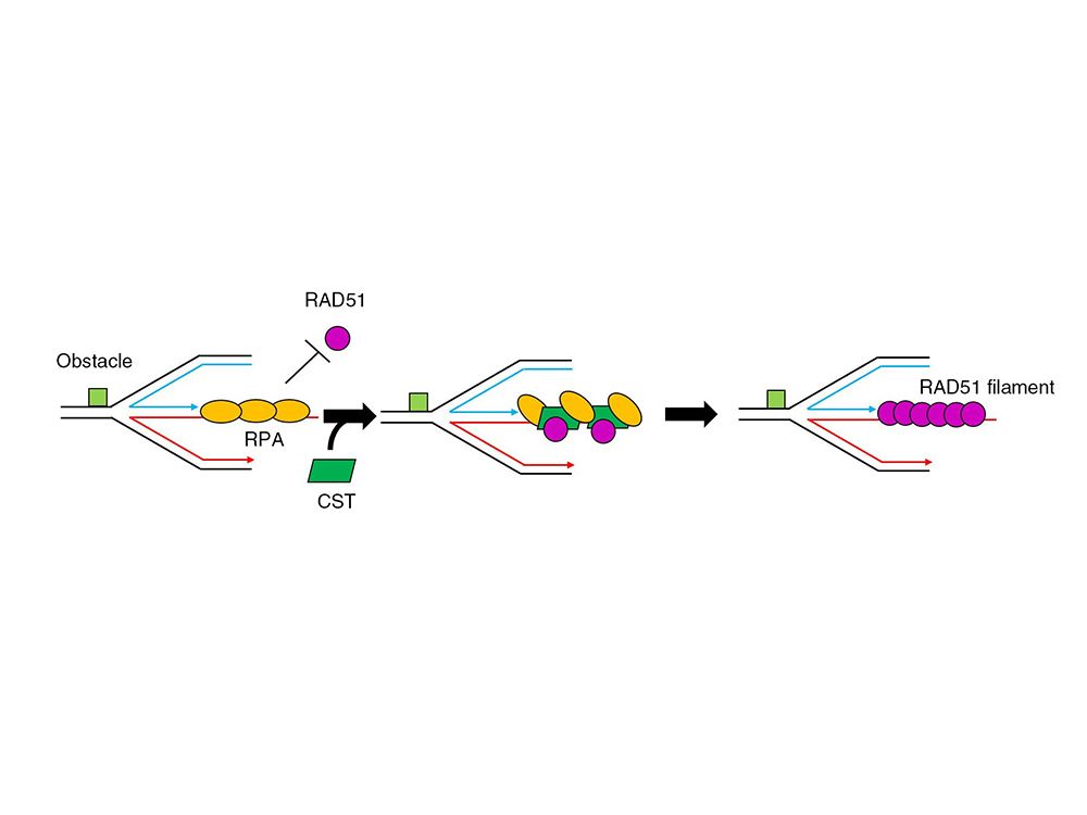 Figure 2. This model explains how CST assists RAD51 to form nucleoprotein filaments on the reversed fork, and to promote DNA replication repair, through (l) binding with RAD51 protein and (2) co-occupation with RPA.