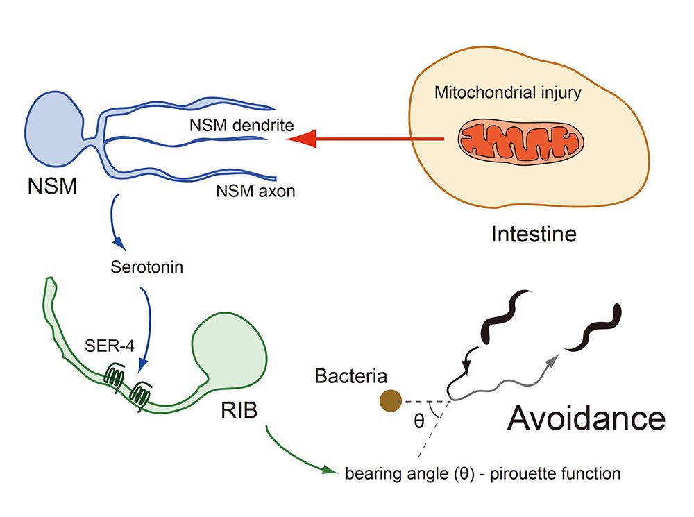 The nervous system of the nematode Caenorhabditis elegans comprises only 302 neurons, yet it is one of the most important model systems in modern neuroscience research due to the availability of advanced research tools in molecular biology and the fact that our understanding of the anatomical structure of the nematode’s nervous system has reached the resolution at the electron microscopic level, on top of the creature’s diverse behaviors. By inhibiting mitochondrial respiration to generate intracellular stress, Prof. Pan’s team induced the nematodes to connect the “harmless bacterial odor” with “cellular pressure”, both occurring at the same time, causing the nematodes to exhibit avoidance behaviors towards bacteria, a pattern comparable to that of classical conditioning. A type of aversive learning crucial to an organism’s survival in nature, this learning behavior is also similar to what the proverb “once bitten, twice shy” conveys: being bitten by a snake causes the victim to become fearful of any object that resembles a snake. Prof. Pan's team further discovered that the NSM neurons of C. elegans increase the synthesis and secretion of serotonin in its initial exposure to stress, which is related to the formation of memory. The serotonin released by NSM binds to SER-4 serotonin receptors on the RIB interneurons, giving RIB the ability to evoke memory. This type of circuit mechanism, which is controlled by different nerve cells for various aspects of memory, can be compared to the memory mechanism in mammals. It is worth noting that due to the tiny size of C. elegans, Prof. Pan's team placed the nematodes into microfluidic chambers and employed high-sensitivity calcium imaging to capture fluorescent images of the responses of the nematodes’ nerve cells to bacterial odors. The results indicate that mitochondrial stress causes novel responses of NSM and RIB neurons to bacterial cues, which suggests that memory and behavioral plasticity result from changes in neuronal activity.