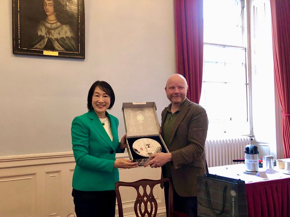 Executive Vice President Chou presenting the Full Bell Porcelain Plate to Prof. James Smith, Vice-Principal International as a gift from NTU to UE.