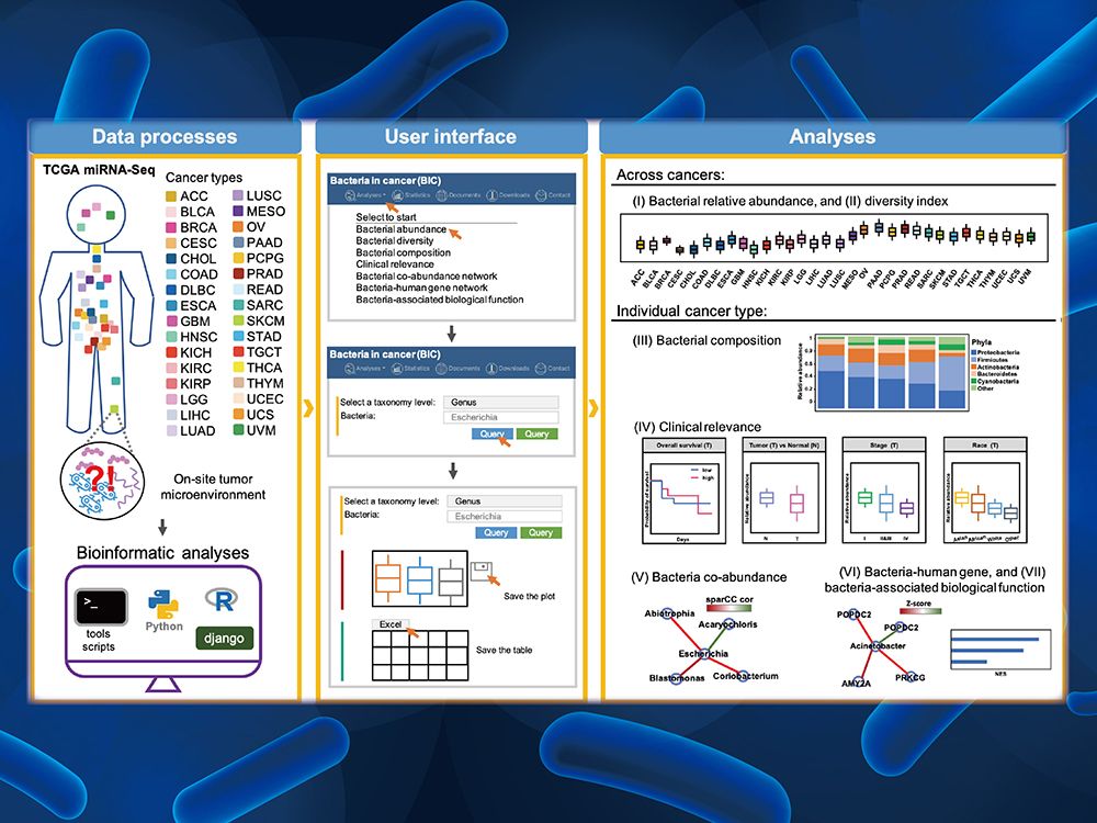Internal organs other than the human gut were previously thought to be sterile. In particular, bacteria detected in tumor tissue are often considered contamination at the time of sampling. Recently, however, increasing evidence has shown that various microorganisms are present in cancer tissues. Based on the concept of "making the best use of everything", this study carried out big data analysis of human cancer microRNA sequence data from The Cancer Genome Atlas (TCGA). By reusing the sequences that should have been discarded because they did not correspond to human genes, and performing sequence alignment with bacterial gene sequence data, the information such as bacterial species and expression quantities present in cancer tissues are obtained and "BIC" database which provides biological information about the cancer microenvironment in relation to the microbial community is then developed. The research results were published in Nucleic Acids Research, the top-ranked journal in the field of biochemical research.