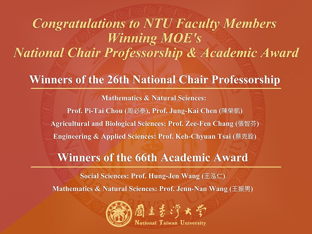 The National Chair Professorship and the Academic Award are two major honors in Taiwan awarded annually by the Ministry of Education to scholars demonstrating prominent achievements in teaching and research. This year, four NTU faculty members have won the 26th National Chair Professorship, and three have been presented with the 66th Academic Award. They are the epitome of academic research in the country. All faculty members and students share a sense of admiration and pride for the recipients’ outstanding academic achievements. Congratulations to them all!
