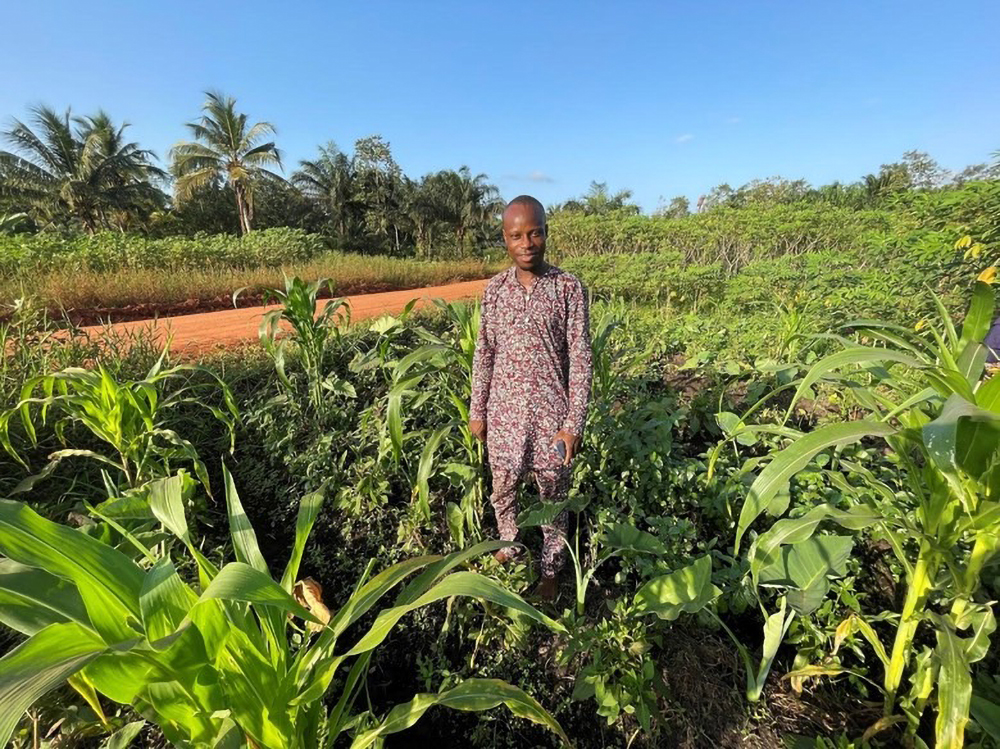 The picture shows a farmer in Benin planting cassava as the main crop along with yams, corn, and amaranth crops.