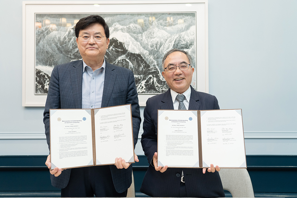 NTU President Wen-Chang Chen (right) and Yonsei University President Seoung Hwan Suh (left) signing the MoU on quantum science and engineering.