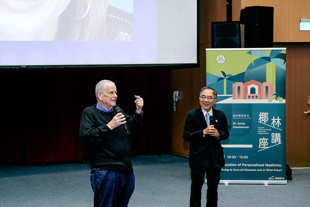 Since its establishment in 2023, NTU Royal Palm Lecture Series has invited outstanding scholars and entrepreneurs to speak on the NTU campus to bestow a global vision upon faculty and students. On April 1, the 5th installment of the Royal Lecture Series has the distinguished honor of inviting globally renowned bio-chemist, also the 2004 Nobel Laureate in Chemistry, Dr. Aaron Ciechanover to speak on the topic “The Revolution of Personalized Medicine – Are We Going to Cure all Diseases and at What Price?” at Shih-Liang Chien Lecture Hall. Dr. Ciechanover touched on how the development of biochemical technologies has led to the third revolution of medicine and the potential conflict of personal privacy with the introduction of personalized medicine. The audience actively engaged with Dr. Aaron Ciechanover by raising a wide range of questions, from breakthroughs in fundamental sciences, doctor-patient relationships, to the distribution of resources in society. Dr. Aaron Ciechanover provided insightful responses, infused with wisdom and humor. Drawing from his own experiences, he encouraged faculty and students to persevere despite the uncertainties, challenges, and setbacks they may encounter on their academic journey, emphasizing that only through relentless effort and persistence can one succeed in research.