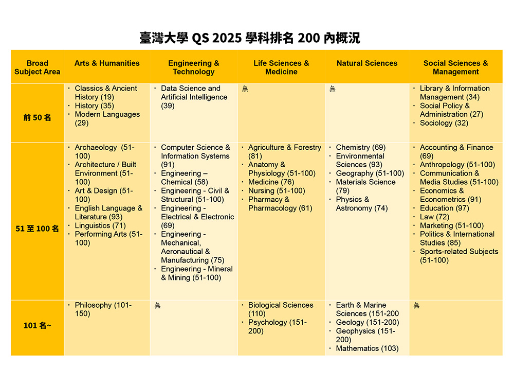 As announced by UK higher education analyst Quacquarelli Symonds (QS), National Taiwan University (NTU) made the Top-200 list in 47 of the 55 subjects it investigated. Among those 47, NTU ranks in the Top 100 in 38 of them