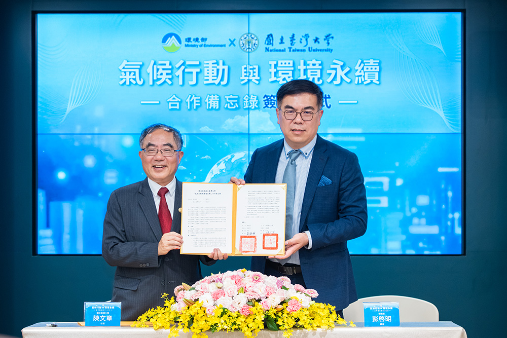 In response to the challenges of climate change and to accelerate Taiwan’s path toward net-zero emissions and sustainable development, National Taiwan University signed a Memorandum of Understanding (MOU) on "Climate Action and Environmental Sustainability" with the Ministry of Environment (MOENV) on April 21, 2025. The agreement was signed by NTU President Wen-Chang Chen and Minister of Environment Chi-Ming Peng. The partnership aims to establish a long-term and stable framework for cooperation, encompassing climate policy and technology research, talent cultivation, and resilience building—jointly shaping a climate action roadmap that balances mitigation and adaptation for Taiwan.