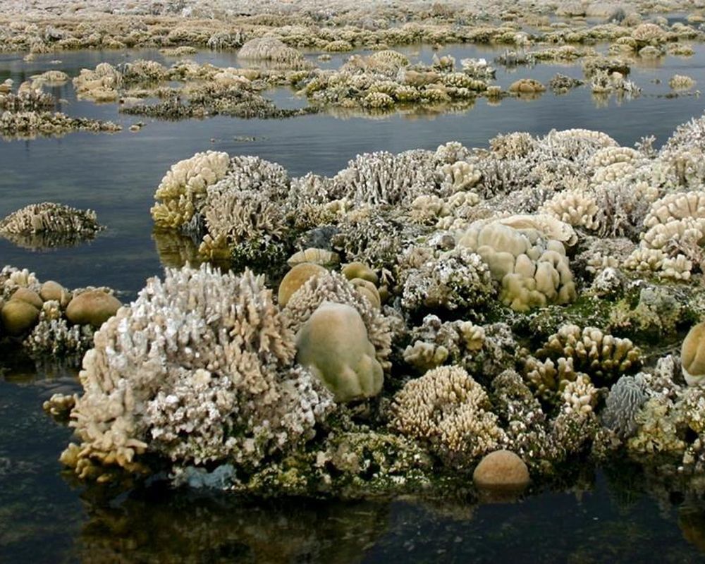 海邊的珊瑚礁。科斯雷人將潮間帶的團塊與扁平狀珊瑚,例如微孔珊瑚、菊珊瑚與腦紋珊瑚,徒手相傳,搬運到墓地,推砌建造珊瑚金字塔。/p>