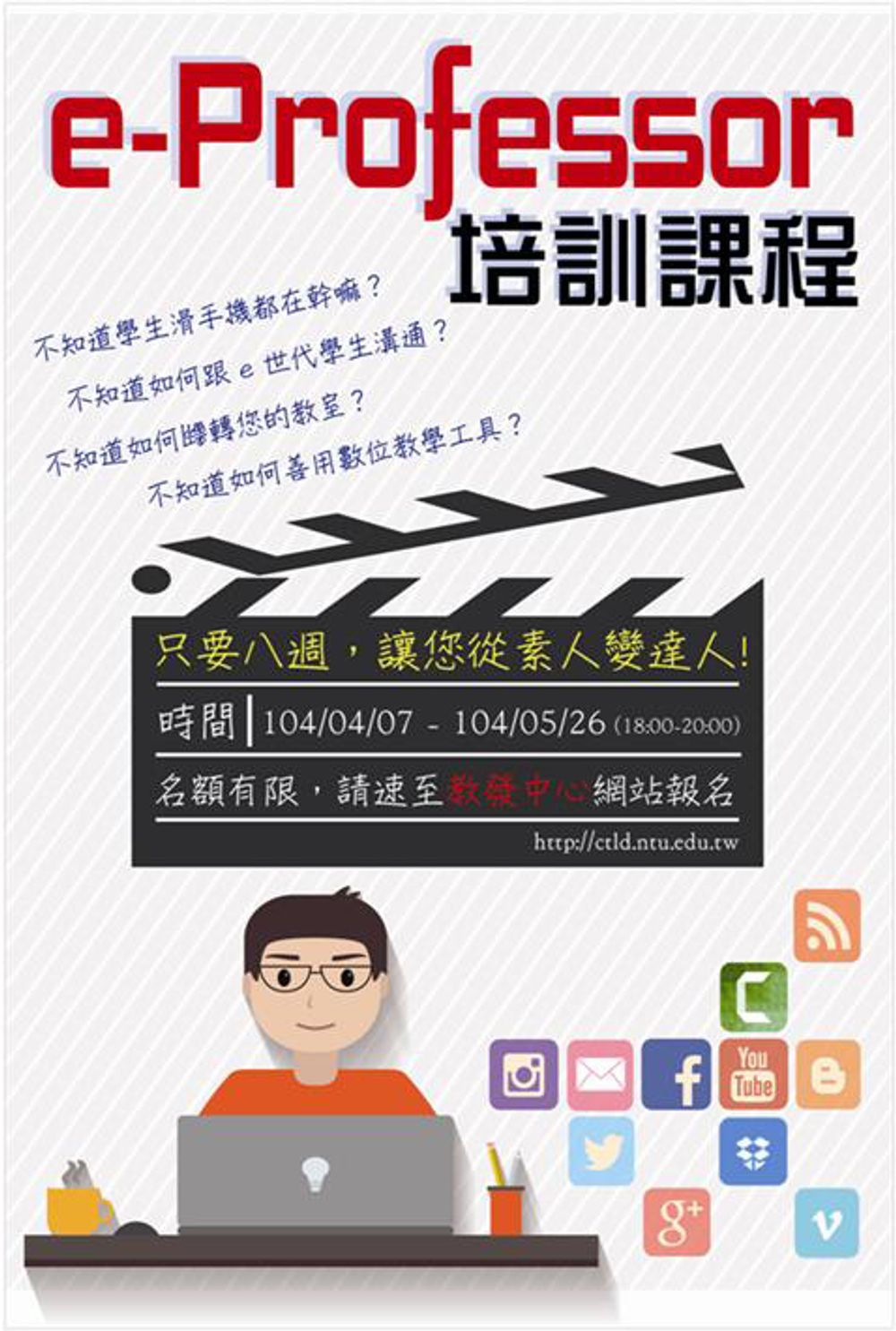 臺大教學發展中心於 4 月 7 日起首度開設連續八週之『e-Professor培訓課程』