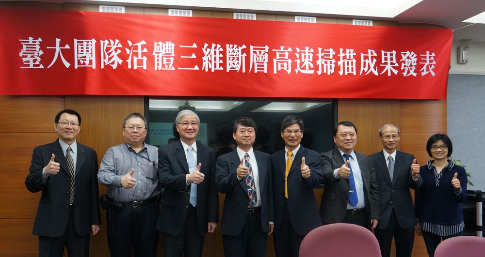 臺大電機系和光電所教授黃升龍之研究團隊創新研發「高速次微米三維斷層掃描儀」於4/22舉辦成果發表會,由楊泮池校長主持。陳良基副校長、光電所林恭如所長、臺大附設醫院陳石池副院長、病理部孫家棟主治醫師、電資學院郭斯彥院長與電機系廖婉君主任共同參與,以期早日實現此項技術於醫療院所並造福國人。