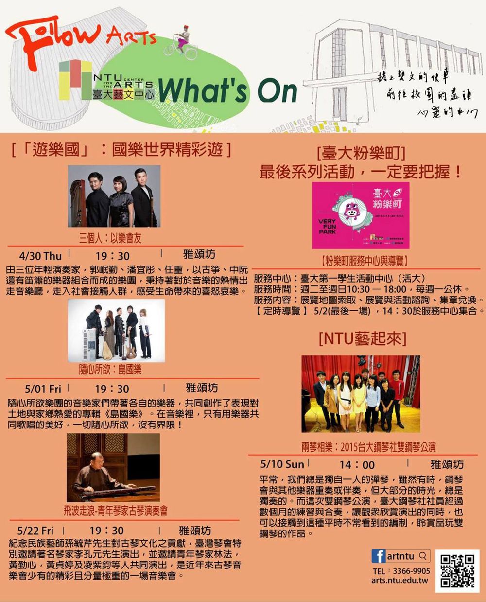 2015.4.28 Tue 12:30-13:10 校總區社科院圖書館外側草坪(自由入場,遇雨改至社科院三樓中庭)