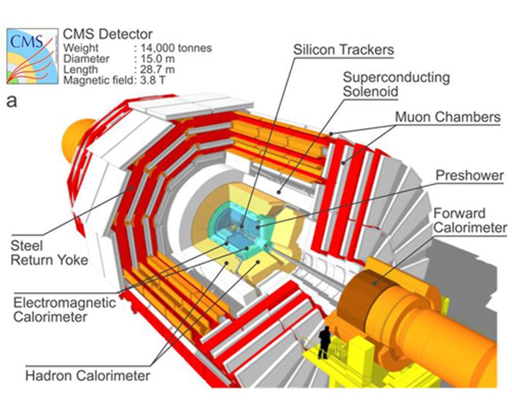CMS 偵測器與其主要架構圖。臺大與中大合建了圖中的Preshower子偵測器,而臺大團隊目前參與軌跡儀Tracker的畫素偵測器第一階段升級建造。