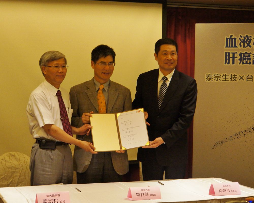 臺大醫學院陳培哲教授、臺大陳良基副校長與泰宗生技徐煥清董事長完成授權簽約。