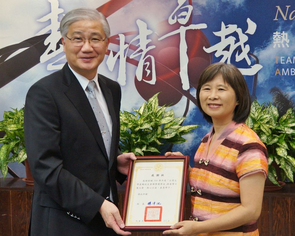 楊校長與「晨曦校友會佛學獎學金」代表陳金玲會長合影。