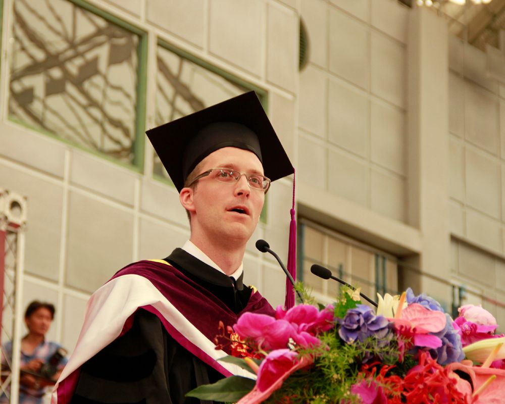 國際學位生代表,社會學系博士班 6 年級韋岱思來自荷蘭烏特列茲大學,他在致詞時以流利的中文表示,站在畢業典禮的講臺,回過頭才發現,在臺大的生活因為有了夥伴而精彩,回味感受一切在臺大美好的生活,希望用母校給予的養分,讓社會變得更好。並以母語祝福大家前程似錦、鵬程萬里。Van harte gefeliciteerd met je afstuderen!