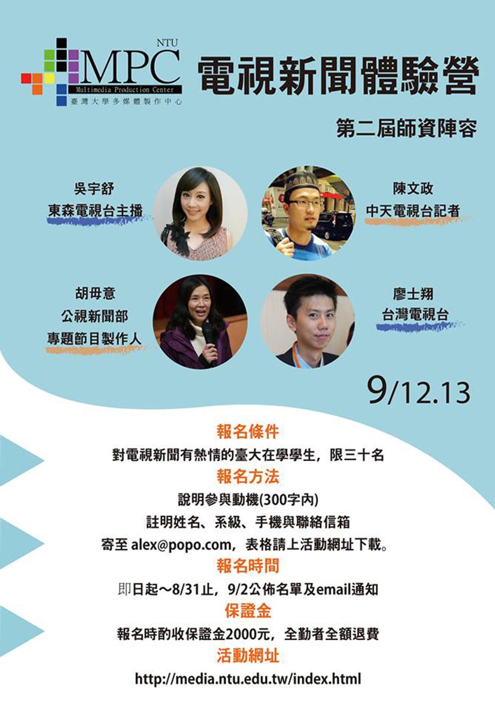為使本校學生認識電視新聞製作過程,臺大多媒體中心特規劃「電視新聞體驗營」活動。本活動由臺大多媒體中心主辦,臺大新聞所協辦,並將邀請業界新聞工作者擔任講師,傳授學員新聞實務知識,同時透過運用該中心攝影棚設備,讓學員對於電視新聞獲得基礎認識與瞭解。