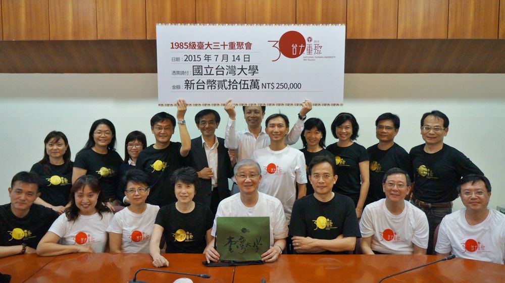 2015年7月14日下午5:30,1985級葉文宏贈畫暨臺大三十重聚會回饋母校儀式,在臺大第三會議室隆重舉行。楊泮池校長,接受1985級重聚會代表──總召彭文正和總幹事文馨瑩等近20位校友,感懷師恩、回饋母校的藝文禮物和25萬元捐款。