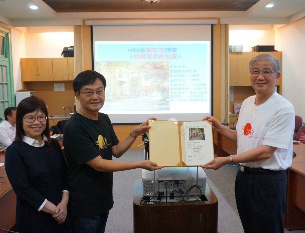 2015年7月14日1985級臺大三十重聚會回饋母校儀式的壓軸獻禮,商學系會計組葉文宏校友,在同班同學太太林琬琬的陪同下,將重聚晚會的兩幀主題畫作──《文學醉美》、《鬱鬰蔥蔥的校園》之原作贈送母校置於行政大樓入口聯合服務中心,歡迎師生前往欣賞兩幅贈畫。