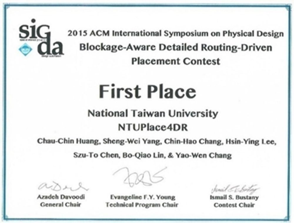 臺大電子與電機研究所於電子設計自動化領域再度創下世界紀錄!今年於美國加州蒙特利市 (Monterey) 舉辦的「ACM 國際積體電路實體設計會議」 (ACM International Symposium on Physical Design, ISPD) 公布為期三個多月的「ACM ISPD細部可繞度導向擺置研發競賽」(ACM ISPD Detailed Routing-Driven Placement Contest)最終結果,由臺大電機系與電子所張耀文教授(電機資訊學院副院長)和電子所博士生黃朝琴、碩士生陳思鐸、楊勝為、林柏僑和電機所碩士生張晉豪與研究助理李昕穎所共同研發的積體電路擺置器NTUplace4dr獲得了第一名的榮耀!