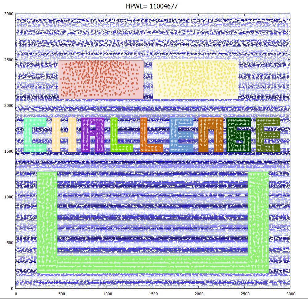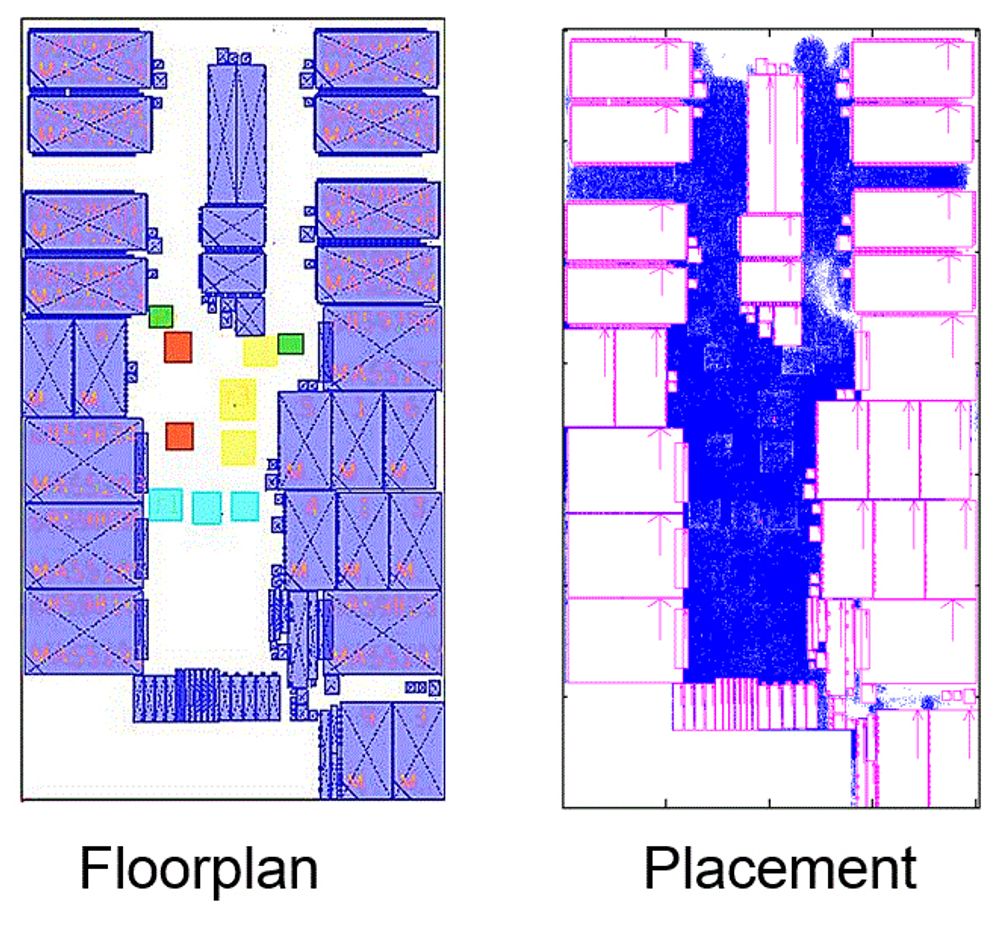 業界測試電路 mgc_superblue11_a,內含 4 種區塊限制和1458個模組、90餘萬個電路元件和90餘萬條訊號線(未顯示於圖中),左圖為其平面規劃,右圖為其擺置結果。
